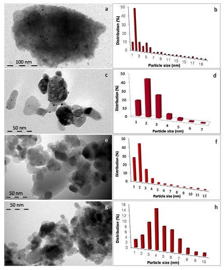 HRTEM images and their corresponding size distribution histograms of Au nanoparticles in (a,b) Au/Al2O3, (c,d) Au/Fe2O3, (e,f) Au/TiO2, (g,h) Au/ZnO. Histograms adapted from [5] with permission from Wiley.