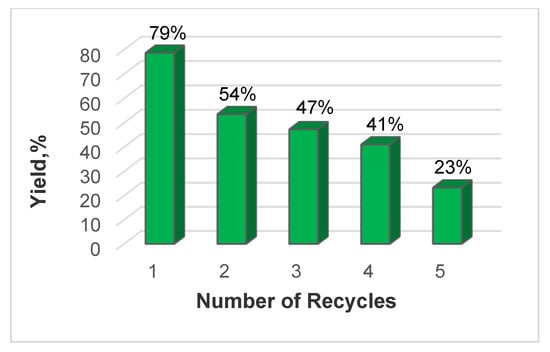 The recyclability of the catalyst Au/TiO2 was probed using the reaction conditions described in Table 3, entry 20, for five consecutive cycles (Figure 5). After each run, the catalyst was separated from the reaction mixture, washed thoroughly with distilled water, and dried overnight before using in the next run. As shown in Figure 5, the yield values decreased after each successive cycle. After the fifth cycle, the reused catalyst was analyzed with TEM (Supplementary Figure S17) and ICP-AES (inductively coupled plasma—atomic emission spectroscopy). As not much Au particles were seen on the used catalyst, it was not possible to obtain a particle size distribution with accuracy. However, it can be observed that the size of the Au nanoparticles increased up to 30 nm (after fifth cycle) due to agglomeration. The ICP-AES result also revealed a decrease in the amount of% Au in the catalyst, from 1.6% to 0.26%. These factors explain the observed drop in the catalytic activity of Au/TiO2 after five successive cycles.