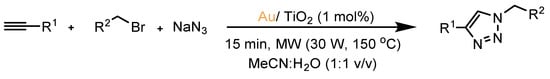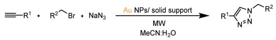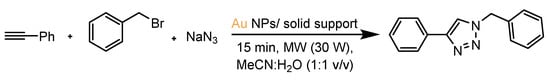 In association with our research interest on the development of effective catalysts for the AAC reaction, this current study presents the use of Au NPs supported on various metal oxides (viz., Al2O3, Fe2O3, TiO2 and ZnO) as heterogenous catalysts. In contrast to the previous stepwise methodologies for AuAAC [4,18] that involved using the unfavourable organic azides, herein a one-pot, three-component protocol was studied under microwave irradiation (MW) where the organic azides are formed in situ by reacting organohalide with sodium azide (Scheme 1). The present method also showcased a ligand-, oxidant/reductant- and additive-free AAC with a short reaction time as compared to the previously reported copper-based [28,38,39] cycloaddition reactions.