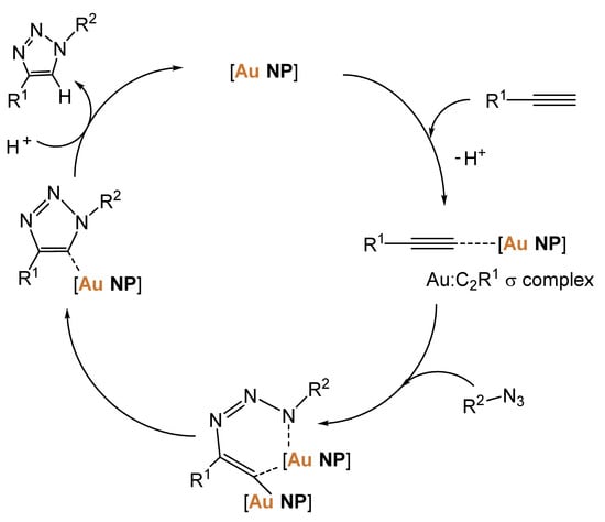 In 2013, Muthusubramanian et al. [4] reported the use of titania-supported Au NPs as catalyst for the Huisgen [3 + 2] cycloaddition of azides and alkynes following a stepwise reaction pathway. The studied Au catalysts were able to produce the 1,4-disubstiuted-1,2,3-triazoles in good to excellent yields. In the following year, Huang et al. [18] studied the ability of gold nanocubes, octahedra and rhombic dodecahedra to catalyze AAC reactions where several triazoles were obtained from a variety of alkynes and organic azides in good yields using the smallest gold rhombic-dodecahedral nanocrystals in the presence of triethylamine base.