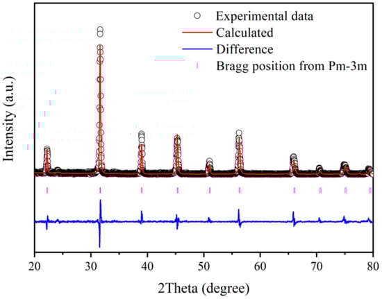 The Rietveld refinement was performed to gain additional insights into the structural information of the synthesized BaTiO3 powder. The structural refinement revealed that the diffraction pattern of BaTiO3 powder fitted well (χ2 = 1.65) with the cubic BaTiO3 pattern in the crystallography open database (COD ID 1507757, space group Pm-3m) (Figure 2) [,]. The results showed that the refined lattice parameters a, b, and c were equal to 4.0014 Å.