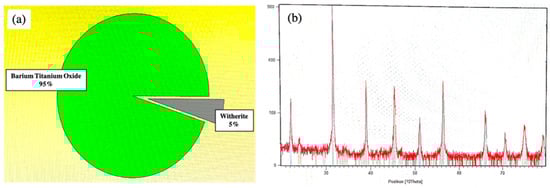 Energy-dispersive X-ray spectroscopy (EDS) was performed to analyze the elemental composition of the synthesized powder. The elemental mapping and EDS spectra of the BaTiO3 powder revealed that it was composed of barium (Ba), titanium (Ti), and oxygen (O). The atomic contents of Ba and Ti were 29.92 at.% and 26.96 at.%, respectively. To confirm the formation of BaTiO3, the atomic ratio of Ba:Ti must be close to 1:1 [,,]. The elemental analysis of the BaTiO3 powder showed a Ba:Ti atomic ratio of 1.1:1, showing the presence of BaTiO3 as the primary phase. As shown in Figure 4.