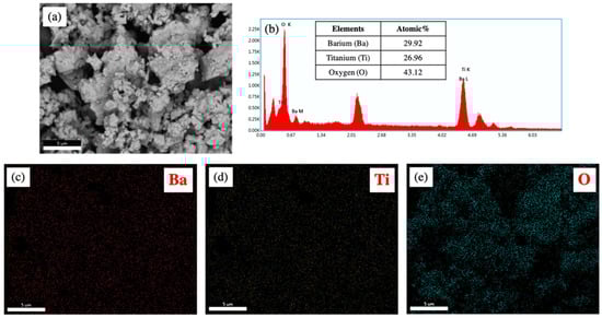 Energy-dispersive X-ray spectroscopy (EDS) results of BaTiO3 (a) SEM image of mapping area, (b) EDS spectra, and elemental mapping of (c) barium (Ba), (d) titanium (Ti), and (e) oxygen (O).