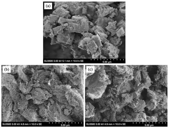 SEM images of (a) barium titanate (BaTiO3), (b) BaTiO3/MWCNT composite (1:1), and (c) BaTiO3/MWCNT composite (2:1).