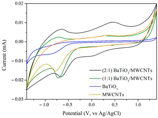 BaTiO3 showed low electrocatalytic activity and a minor reduction peak (Figure 6). Compared with BaTiO3, BaTiO3/MWCNT composite-based electrode showed superior electrocatalytic activity based on a higher peak current. This can be attributed to the large SSA of the CNTs, which provides additional active sites for reactions and enhances electron transfer. MWCNT-based materials have been used to fabricate cocatalysts and support many catalytic applications. According to Sato et al., carbon-supported metal–oxide composites show excellent electrocatalytic performance owing to the tuned electronic states of catalysts []. Therefore, combining carbon materials and metal oxides can enhance the catalytic process [,,]. The synergistic effects of metal oxides and large-SSA carbon-based materials on electrocatalytic activities have been reported in many studies [,]. A similar observation was clearly evident in this study. The BaTiO3/MWCNT composites showed excellent electrocatalytic activities based on the prominent reduction and oxidation peaks in the presence of citric acid.