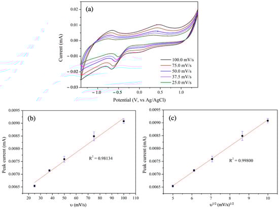 The CV measurements of the BaTiO3/MWCNT composite (2:1) in 500 µM citric acid were conducted at scan rates of 25.0–100.0 mV/s (Figure 7a). The cyclic voltammograms exhibited two prominent peaks, corresponding to oxidation reactions at applied voltages ranging from −0.74 to −0.65 V and 0.35 to 0.47 V. The peaks corresponding to reduction reactions were observed at applied voltages ranging from −0.67 to −0.51 V and 0.02 to 0.12 V. The correlation between the peak current and scan rate or square root of the scan rate was employed to determine the mechanism involved in electrocatalytic reactions. A good linear relation (R2 > 0.75) between the peak current and scan rate suggested the presence of an adsorption-controlled reaction, whereas a good linear relation between the peak current and square root of the scan rate indicated a diffusion-controlled reaction [].