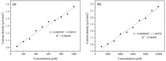 Current density–analyte concentration calibration curves for the BaTiO3/MWCNT composite (2:1)-based electrode in (a) 100–1000 µM and (b) 1000–10,000 µM citric acid measured at a scan rate of 100 mV/s for the reduction reaction at −0.67 V.