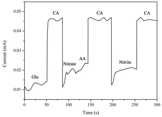 Chronoamperogram of the BaTiO3/MWCNT composite (2:1)-based electrode in 500 µM glutamate (Glu), 500 µM citric acid (CA), 500 µM nitrite, 500 µM ascorbic acid (AA), and 500 µM nitrite at an applied voltage of −0.67 V.