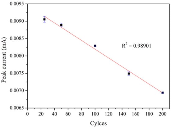 The stability of the BaTiO3/MWCNT composite (2:1)-based electrode for citric acid detection was examined based on the peak current after repeating cycles (Figure 10). After 200 cycles, the peak current decreased by 23.31%, which was in the acceptable range for sensing materials reported by other researchers [,].