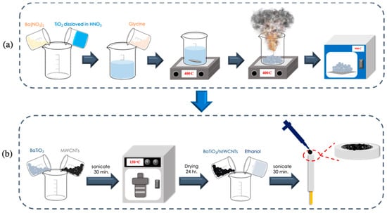 Schematized procedures for synthesizing the (a) BaTiO3 powder using the solution combustion method and (b) BaTiO3/MWCNT composite-based electrode.