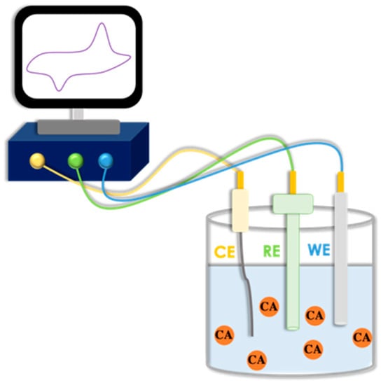 Based on this discussion, the detection of citric acid is essential, which can be achieved using several techniques, including high-performance liquid chromatography (HPLC) and capillary electrophoresis [,]. However, because of the requirements of high-cost instruments and experienced operators, these techniques are unsuitable for point-of-care testing applications. Furthermore, colorimetry, visible–near-infrared spectroscopy, and fluorescence spectroscopy have been used for citric acid detection [,,]. However, colorimetry is unsuitable for detecting colorless samples []. In the presence of interference in the sample, a high noise signal may be detected in spectroscopic techniques. Alternatively, nonenzymatic electrochemical sensing techniques exhibit good simplicity, sensitivity, selectivity, reusability, and stability and thus can be used for the quantitative detection of citric acid []. The electrochemical activity and performance of electrochemical sensors are often evaluated using cyclic voltammetry (CV) because of its simplicity, fast operation, low cost, and capability to analyze both organic and inorganic analytes [,].