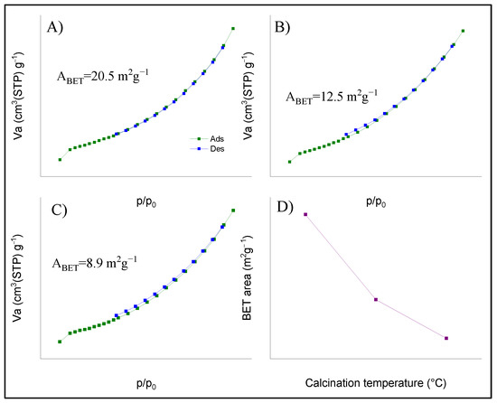 The textural properties of all samples were studied by the N2 adsorption–desorption analysis (Figure 4). According to the IUPAC classification, these samples presented isotherms type II without any evidence of hysteresis process during the desorption step [34]. This kind of isotherms is associated with non-porous or macroporous materials. Moreover, the specific surface areas (ABET) were determined using the BET model, resulting in relatively low values. As it would be expected, the ABET values decreased as a function of calcination temperature, from 20.5 m2/g on LNO-600 to 8.9 m2/g on the sample LNO-800 (see Figure 4D). The above can be explained by the sintering of LaNiO3 particles promoted by thermal effects. All these results are in good agreement with the thermal treatments applied to the samples.