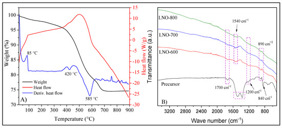 To complement the characterization, the different LaNiO3 samples, as well as the precursor powder (prior calcination), were characterized by thermogravimetric (TG), differential thermal (DT), and infrared spectroscopy using the ATR-FTIR arrange. Figure 5A shows the TG and DT analyses of precursor. These curves evidence the dehydration process (85 °C) and the decomposition of all the remaining nitrates and organic compounds at 420 and 585 °C. Based on that, 600 °C was established as the lowest temperature used for the LaNiO3 calcination. In addition, the ATR-FTIR spectra did show some minor differences among the samples (Figure 5B). The vibration bands observed between 1500 and 1400 cm−1 and the less intense band at 840 cm–1 indicate the presence of coordinated nitrates. These signals tended to disappear after calcination, indicating that this precursor decomposes to give rise to the desired phase [35]. Likewise, the bands at 1700 and 1540 cm−1 are associated with the vibration of the C=O bond, while the vibration bands at 1200 and 890 cm−1 refer to the C–O and the C–O–H bonds, respectively [36,37]. These bonds arise from the complexing precursors (EDTA and citric acid). Their intensities decrease until some of them disappear in the sample calcined at 800 °C, indicating the complete calcination of the precursors. However, the bands at 1440 and 890 cm−1 remain in all the samples, and these signals can be attributed to the adsorption of H2O and CO2 from the atmosphere since in TG analyses (Figure 5A) did not show any mass loss at temperatures higher than 700 °C [38,39].