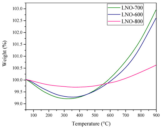 An additional TG analysis was carried out under an O2 atmosphere to elucidate the presence of LaNiO3 vacancies (Figure 6). These thermograms showed weight loss lower than 0.75% for LNO-600 and LNO-700 and 0.30% for LNO-800 at T < 300 °C, attributed to surface dehydration and dehydroxylation processes. After that, the thermograms showed a continuous weight increase process between 350 and 900 °C, indicating the O2 sorption associated with the presence of anion vacancies (Va)—most likely oxygen vacancies—where the mass gain is 3.7, 3.0, and 0.5% for LNO-700, LNO-600, and LNO-800, respectively. These results confirmed that LaNiO3 samples obtained at lower calcination temperatures present larger amounts of oxygen vacancies.