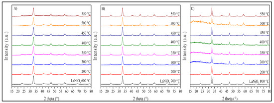 XRD patterns of the LaNiO3 samples synthetized at 600 (A), 700 (B) and 800 °C (C) after their catalytic performance at different temperatures. The amorphization—mainly observed in some of the LNO-800 sample products—corresponds to the glass sample-holder diffraction produced due to the small quantity of sample recovered after the catalytic experiments.
