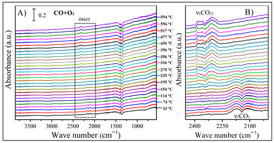 DRIFTS spectra obtained between 30 and 600 °C for the CO oxidation process using the LNO-600 catalyst (A) and the corresponding amplification of the spectral region (2475 and 2000 cm−1) where the CO and CO2 vibrational modes appear (B).