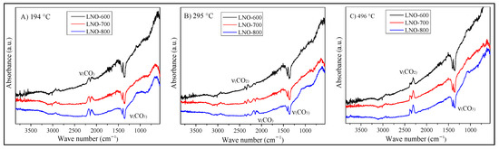 In addition, for a better comparison of the catalytic activity of the samples, Figure 14 shows the DRIFT spectra of the different samples at three specific temperatures. Initially, at 194 °C (Figure 14A), the only vibration bands observed correspond to CO and the carbonates, agreeing with the spectra interpretation described above, regardless of the analyzed sample. In other words, the surface CO oxidation is not taking place at this temperature. Moreover, an additional vibration band is observed at 880 cm−1, associated with the La(OH)CO3 complex [38]; this band was also identified in the IR spectra shown in Figure 5B. In fact, the formation of this vibration band is better developed in the LNO-800 sample. As the carbonate signal previously described, the formation of this lanthanum hydroxyl-carbonate must be produced only at the surface, associated with the sample exposition to the environment, as there is not any water supply during the catalytic process. The presence of these adsorbed species in the LNO-800 sample may be blocking the active sites, reducing the CO oxidation process, in agreement with the activity results (Figure 10D).