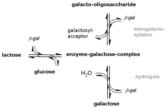Functional foods with positive effects on health are becoming increasingly important [1]. One of the most common food additives used for functional food are prebiotics, which are substrates that are selectively utilized by host microorganism conferring a health benefit [2]. They serve as “feed” for the intestinal bacteria and thus influence the growth and activity of a healthy intestinal microbiota [3]. A greater interest exists in utilization of galacto-oligosaccharides (GOS) as health-promoting food supplement for infant as well as for clinical but also for animal nutrition [4]. Oligosaccharides can be found in nature, e.g., as part of human breast milk in high concentrations. In contrast, bovine milk contains oligosaccharides as minor components only [5,6]. Thus, a promising approach for GOS formation is provided by the enzymatic synthesis from bovine lactose using β-galactosidase (β-gal). Furthermore, as lactose is a side product of the dairy industry on a large scale, the enzymatic conversion to the prebiotic GOS offers a sustainable and value-added utilization of the resource.