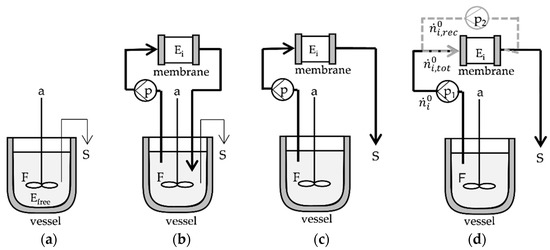 Four reactor configurations with increasing complexity, as illustrated in Figure 2, were evaluated by experimental and model-based studies. The reference system is the discontinuous batch reactor with free enzyme (Figure 2a), whereas (b–d) are the reactor systems for immobilized enzymes striving for achieving intensified continuous process conditions.