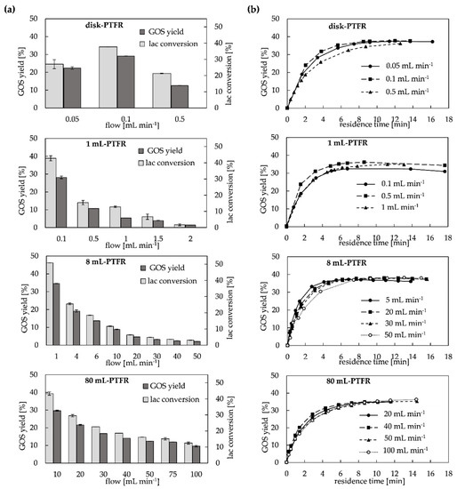 For continuous configuration (Figure 2c) the experimental data for the scale-up from disk size up to 80 mL-PTFR is shown in Figure 3, wherein (a) represents the GOS yield as a function of the flow rate and (b) as function of the residence time. The substrate lactose only passes through the monolith once. The GOS yield and the lactose conversion are therefore directly dependent on the residence time. The lower the flow, the higher the yield or conversion in the mass transfer limiting area [23,40]. The maximum achievable flows are 5 mL min−1 for the disk, 16 mL min−1 for the 1 mL-PTFR, 100 mL min−1 for the 8 mL-PTFR and for the 80 mL-PTFR 400 mL min−1 [35]. Limitations with regard to the enzyme catalyzed reaction in the PTFR are excessive low flow rates, which can lead to backmixing due to diffusion (see disk-PTFR: 0.05 mL min−1 in Figure 3a), and excessive high flow rates, which reduce the residence time too much.