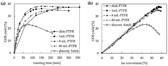 Performance of monolithic PTFRs (disk, 1 mL, 8 mL and 80 mL): (a) GOS yield and lactose conversion for the continuous configuration depending on the flow (ILC = 100 g L−1); (b): GOS yield based on residence time (ILC = 100 g L−1).