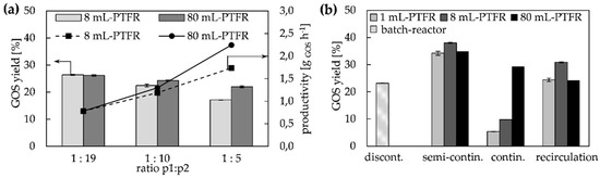 The experimental observations with respect to flow ratio with the 1 mL-PTFR were then transferred to the scale of 8 mL- and 80 mL-PTFRs. The recirculation ratios of 1:19 (p1 = 10.5 mL min−1, p2 = 9.5 mL min−1), 1:10 (p1 = 0.9 mL min−1, p2 = 9.0 mL min−1) and 1:5 (p1 = 1.7 mL min−1, p2 = 8.3 mL min−1) were studied experimentally with regard to the maximum GOS yield. The flow through the 8 mL- and 80 mL-PTFRs was 10 mL min−1 in each case, i.e., the retention time per flow ratio is the same for each monolith. Again, the highest GOS yield was determined with the highest ratio between feed flow and recirculation flow, which is 26% for both PTFRs (Figure 5). With a five-fold higher recirculation flow compared to the feed flow, the 8 mL-PTFR achieved a GOS yield of 17% and 22% with the 80 mL-PTFR (Figure 5a). However, the consideration of productivity of the continuous configuration with recirculation is important for scaling-up and evaluating the overall process. Thereupon it becomes apparent that the production of GOS in g per hour increases, although the maximum GOS yield is lower (Figure 5a). This is due to the fact that the feed flow (same as the product flow) with a setting of 1:19 is too slow to gain a correspondingly high amount of GOS.