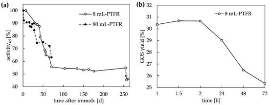 The initial lactose conversion of each experiment was studied at flow rates of 10 mL min−1 for the 8 mL-PTFR and 20 mL min−1 for the 80 mL-PTFR (Figure 6a). The 8 mL-PTFR revealed a residual activity of 46% after 261 days (9 months) of intensive use including storage at 7 °C (in 0.1 M Ka-Na-phosphate buffer with 0.02% sodium azide). The enzyme on the 80 mL-PTFR still had a relative activity of 63% after 71 days. In Figure 6a, it can be seen that the course of the decrease in enzyme activity is very similar in both immobilized PTFRs. Thus, the use of CIM® monolithic PTFRs as immobilization support proves to be very suitable in terms of maintaining enzyme activity. High stability of the CIM® materials has also been reported in the literature, with an immobilized endodextranase remaining more than 78% active [37] and an immobilized ribonuclease remaining 77% active on epoxy monoliths after 28 days of storage. [25]. The immobilization of β-gal from B. circulans on Eupergit® beads was considered for longer periods and led to an enzyme half-time at a lactose concentration of 380 g L−1 of 90 days [17], which is in the same range as we observed for the 8 mL-PTFR. Whereas the enzyme stability on agarose beads was reported only for the actual time of use, remaining almost 100% stability over 4.7 h (14 cycles a 20 min) was obtained [39]. The decrease in GOS yield within a 3-day test in continuous configuration with recirculation (Figure 2d) is shown in Figure 6b. The permanent use of the enzyme leads to a decrease in the GOS yield of only 6% after 72 h.