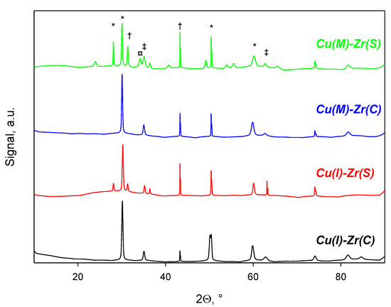 The as-prepared samples were labeled as Cu(X)-Zr(Y), where X indicates the approach for copper deposition (I: impregnation with copper acetate; M: metal–organic-framework-mediated synthesis route), and Y indicates the type of zirconia (C: commercial; S: prepared by the sol–gel method).