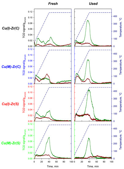 Moreover, the used Cu(M)-Zr(S) is the only sample that does not show any low-temperature peak and an increase in the high-temperature peak after reaction.