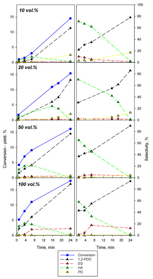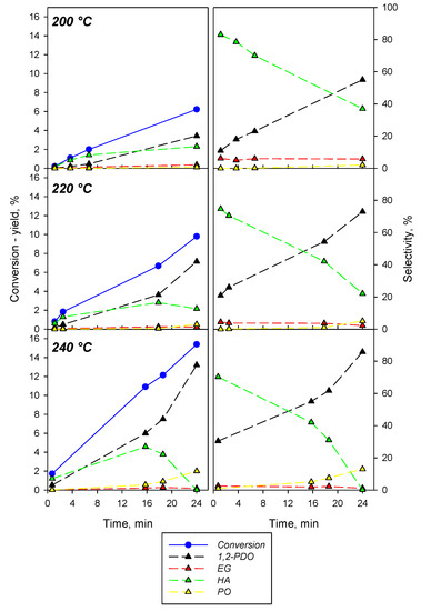 Figure 8 shows the effect of reaction temperature as a function of reaction time, operating at 20 vol% H2 concentration in the gas phase (initial pressure = 20 bar(g)). Glycerol conversion steadily increases as the temperature increases and is quite linear with the reaction time. The 1,2-PDO yield grows as well; interestingly, it increases more than linearly with the reaction time as well as its selectivity. The HA yield shows a sublinear growth at 200 °C, while it shows a volcano shape at higher temperatures; its selectivity steadily decreases by increasing both the reaction time and temperature. This behavior is typical of the reaction mechanism involving the formation of intermediate species in a series reaction scheme, as suggested by Gabrysch et al. [46]. The reaction rate of the hydrogenation of HA to 1,2-PDO increases as the temperature grows; this increase is even higher than that of glycerol dehydration to HA, as suggested by the reduction of selectivity at high temperature. EG yield is very low-independent from the temperature and the reaction time, and it increases as conversion increases. Accordingly, EG selectivity is quite constant with reaction time; a slight decrease is detected by increasing the temperature. Thus, it can be inferred that glycerol dehydration is preferred to the direct hydrogenation of glycerol to ethylene glycol and methanol, which occurs at a quite constant rate at a fixed temperature. The reaction rate of glycerol dehydration to HA increases more than that of the direct hydrogenation of glycerol to ethylene glycol and methanol. The overhydrogenolysis to the 1-propanol reaction step follows the trend of series reactions; the corresponding yield and selectivity increase with both the reaction time and the temperature.