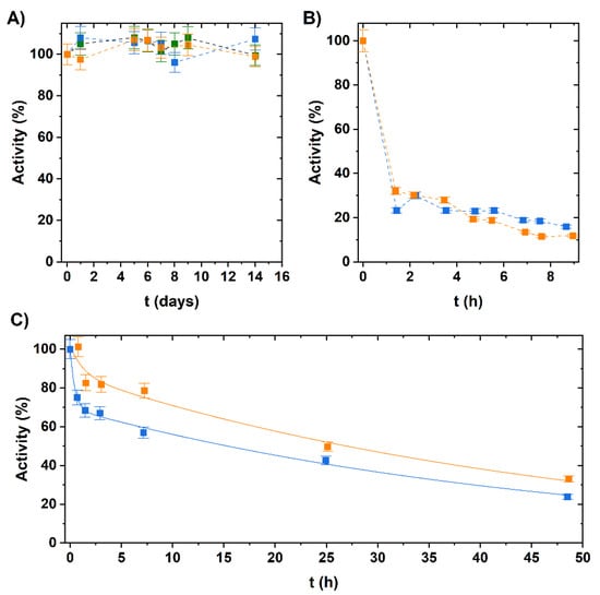 - Mateo, C.; Bolivar, J.M.; Godoy, C.A.; Rocha-Martin, J.; Pessela, B.C.; Curiel, J.A.; Muñoz, R.; Guisan, J.M.; Fernández-Lorente, G. Improvement of Enzyme Properties with a Two-Step Immobilizaton Process on Novel Heterofunctional Supports. Biomacromolecules 2010, 11, 3112–3117. [Google Scholar] [CrossRef] [PubMed] [Green Version]