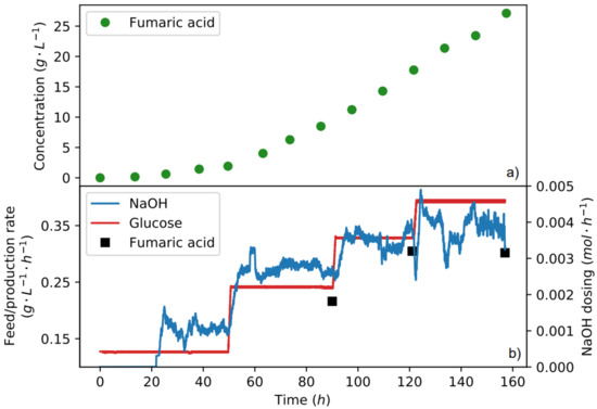 All of the fermentations were conducted with immobilised R. oryzae in a bio-reactor, which allowed for the control of the fermentation conditions. These primarily included the pH, temperature, dilution rate and medium composition. An experimental run consisting of around 200 remained at constant pH and urea addition rate while the glucose feed rate was altered. Different glucose rates during a run represent processing windows. Each window was considered as a separate processing condition where distinct rates and yields could be calculated. The window spans typically lasted 36 , and the last 24 were considered for the calculation of the specific state. Figure 1 indicates the glucose feed rate and NaOH dosing rate for four separate windows; it is evident from the figure that rapid dynamic changes occurred around the step while more stable dosing rates occurred towards the end of the window. In order to calculate the true production rate of metabolites, a mole balance was performed over the last 24 h of operation where differences in high-performance liquid chromatography (HPLC) determined the concentration values (shown in Figure 1a), and the continuous dilution rate was used (see Section 3.5). The procedure enabled four to five separate processing conditions within a single run. The calculated fumaric acid production rates (black squares) can be seen in Figure 1b for each window. The consolidated data from each window will subsequently be used for the analysis of the fermentations.
