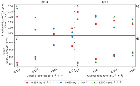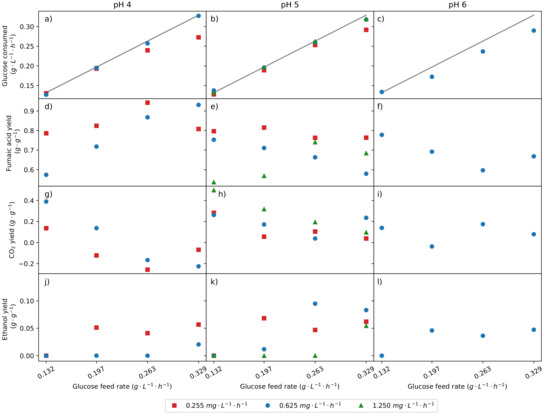 Figure 2a–c are parity plots between the glucose fed and the glucose consumed for various conditions. At low glucose feed rates, it can be seen that all the glucose feed is consumed. The line (black line) indicates the point of full glucose consumption. Points below the line indicate glucose accumulation and suggest suboptimal glycolytic flux. For the urea feed rate of and pH 4, it can be seen that there was full consumption of glucose at all the glucose feed rates. For pH 5, at the highest glucose feed rate of , a slight drop in glucose consumption can be seen. However, looking at the glucose consumption for pH 6, from a glucose feed of , glucose accumulation is observed. It is clear that at a lower pH, more glucose can be consumed. This indicates that the pH inhibits some crucial pathway in the consumption of glucose, either in the uptake of glucose or in the metabolism of it. The rate at which glucose is consumed is to be maximised, provided the fumaric acid yield is maintained, as this will increase fumaric acid productivity, which is of key importance. It was also found that the urea feed rate affected the glycolytic flux. The lowest urea feed rate of has a negative effect on the glycolytic flux. It can be seen that for both pHs 4 and 5, the glycolytic limit is reached first for the lowest urea feed rate. Through the repeatability experiments, it was determined that, at least within the time frame of the experiments conducted (approximately 200 ), no decay of the glucose consumption rate was seen for the urea feeds of or . This shows that the decreased glycolytic flux seen for the lowest urea feed is a result of the condition and not the length of the experiment.