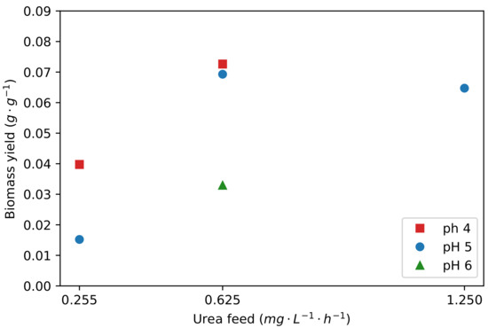 The effect of pH and urea addition on the yield of biomass on glucose. As indicated in Table 1, repeat experiments were conducted, and the average values of the two experiments are presented. For the conditions that were not repeated, single fermentation values were used.
