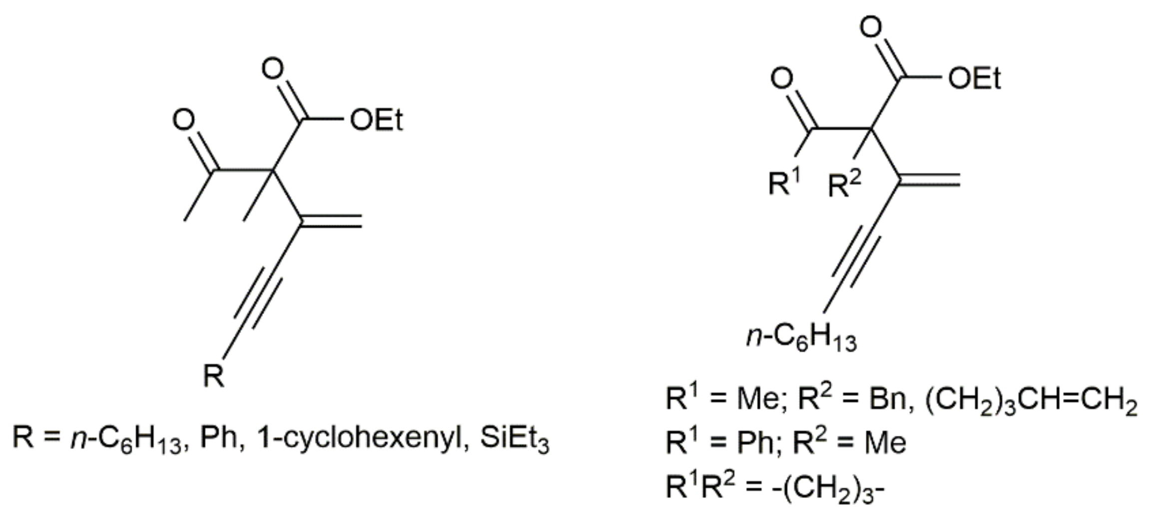 - Houk, K.; Hopf, H.; Stang, P.; Nicholas, K.M.; Schore, N.; Regitz, M.; Nicolaou, K.C.; Gleiter, R.; Scott, L.R.; Grubbs, H.; et al. Modern Acetylene Chemistry; Stang, P.J., Diederich, F., Eds.; Wiley-VCH: Weinheim, Germany, 1995. [Google Scholar]