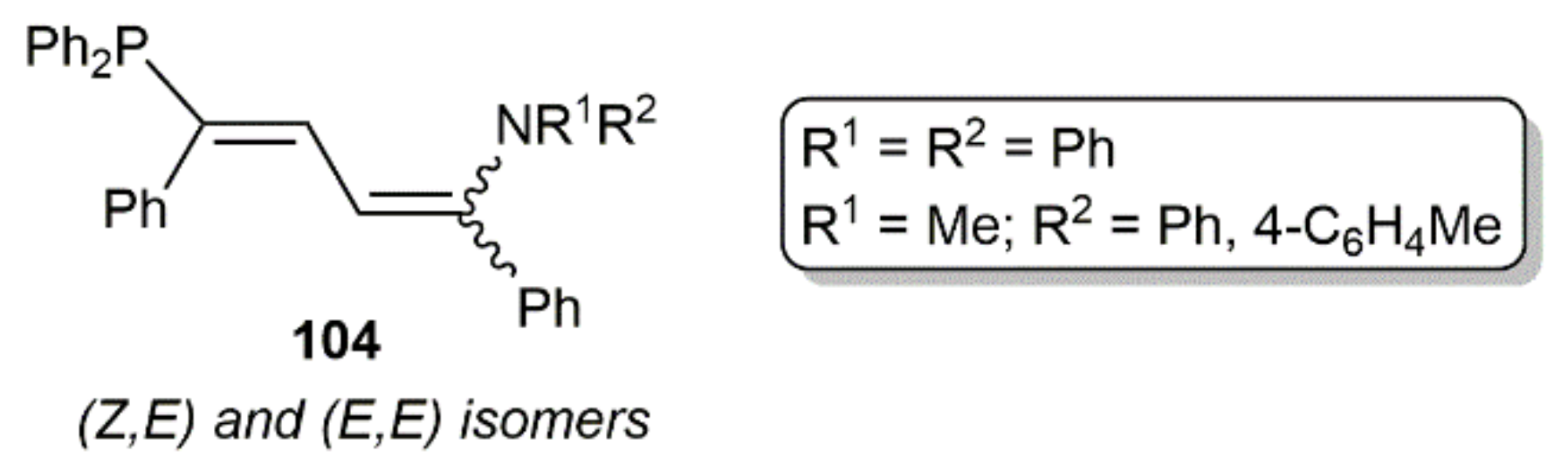 - Younis, F.M.; Krieck, S.; Al-Shboul, T.M.A.; Görls, H.; Westerhausen, M. Calcium-mediated synthesis of 1-(diorganylamino)-1,4-diphenyl-4-(diphenylphosphanyl)buta-1,3-dienes. Inorg. Chem. 2016, 55, 4676–4682. [Google Scholar] [CrossRef] [PubMed]