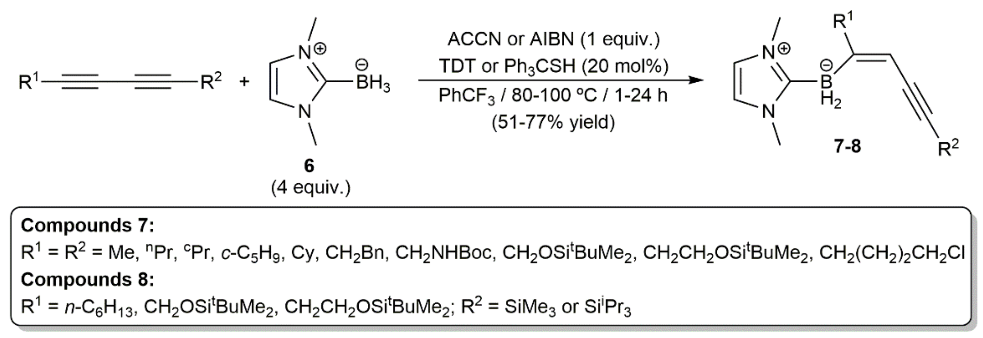 - Takahashi, K.; Geib, S.J.; Maeda, K.; Curran, D.P.; Taniguchi, T. Radical trans-hydroboration of substituted 1,3-diynes with an N-heterocyclic carbene borane. Org. Lett. 2021, 23, 1071–1075. [Google Scholar] [CrossRef] [PubMed]