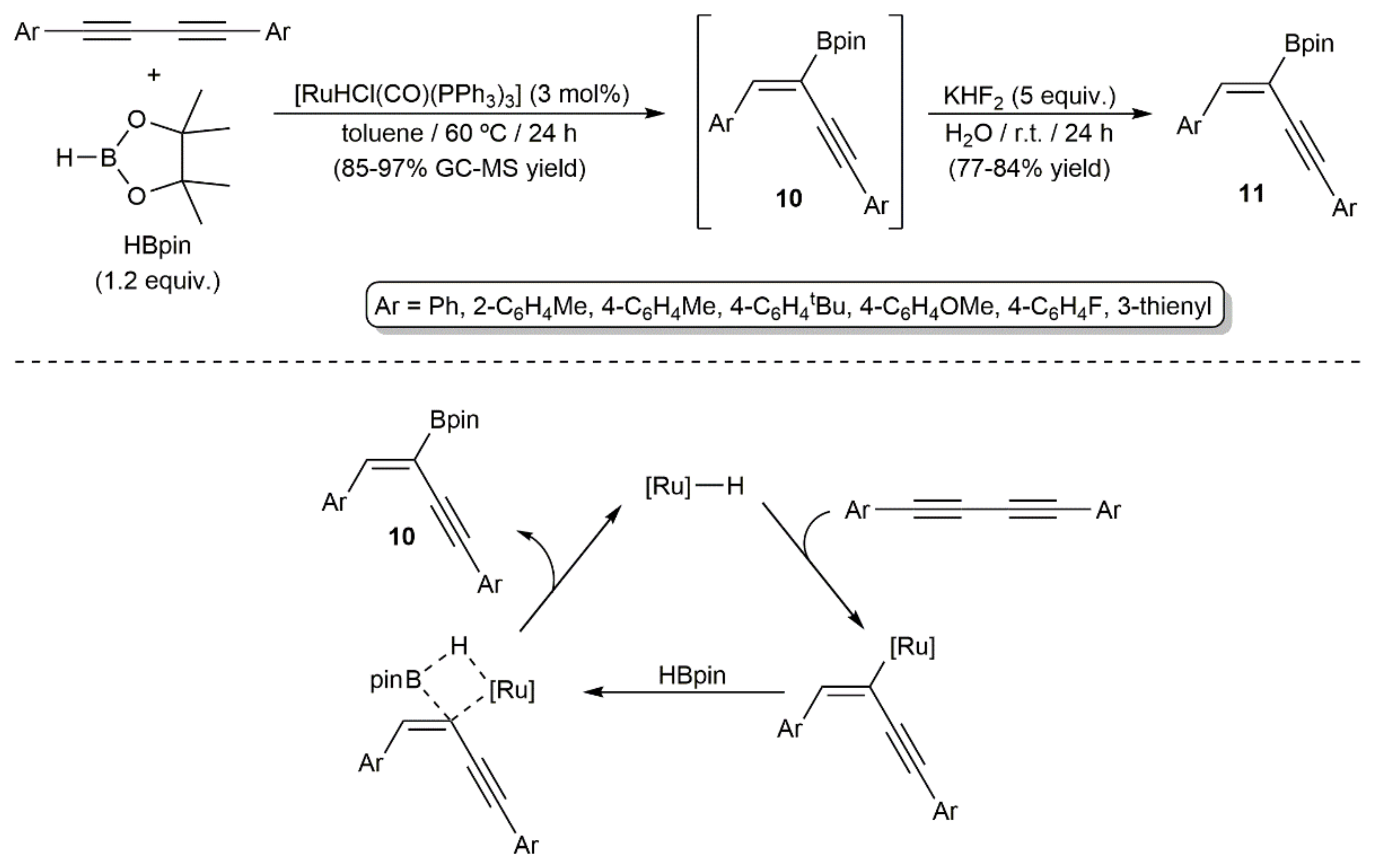 - Sokolnicki, T.; Szyling, J.; Franczyk, A.; Walkowiak, J. Regio- and stereoselective synthesis of enynyl boronates via ruthenium-catalyzed hydroboration of 1,4-diaryl-substituted 1,3-diynes. Adv. Synth. Catal. 2020, 362, 177–183. [Google Scholar] [CrossRef] [Green Version]