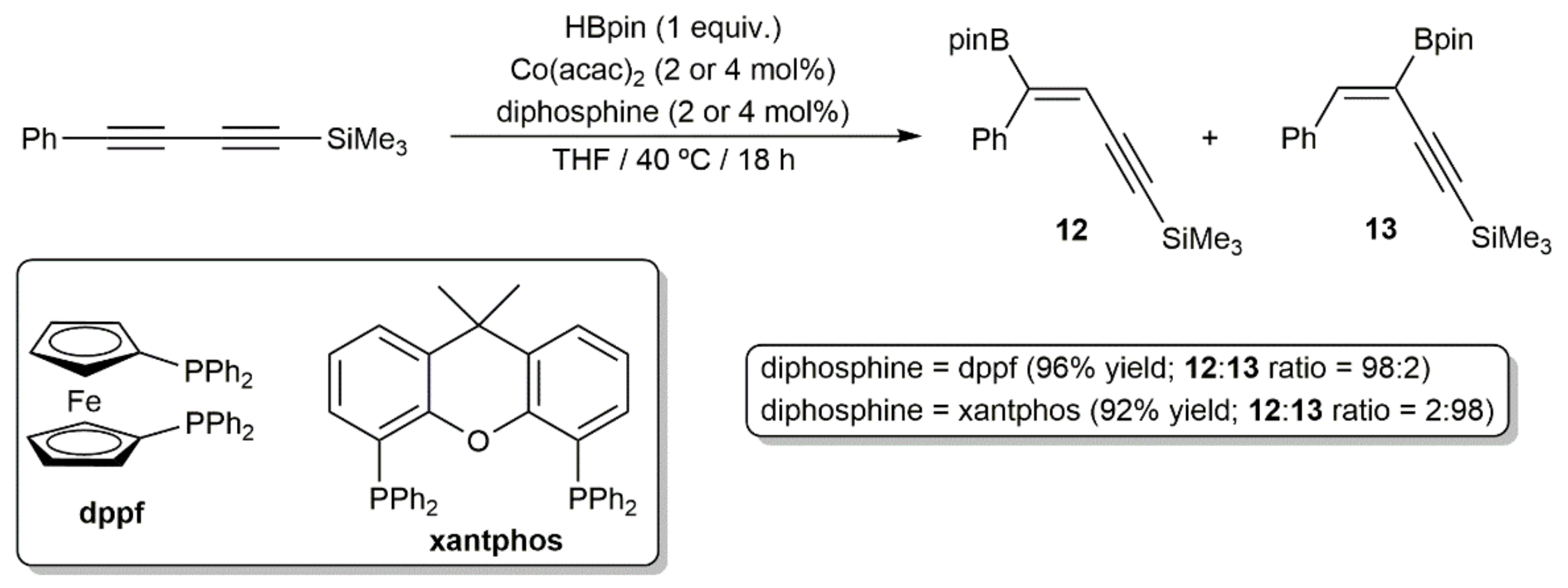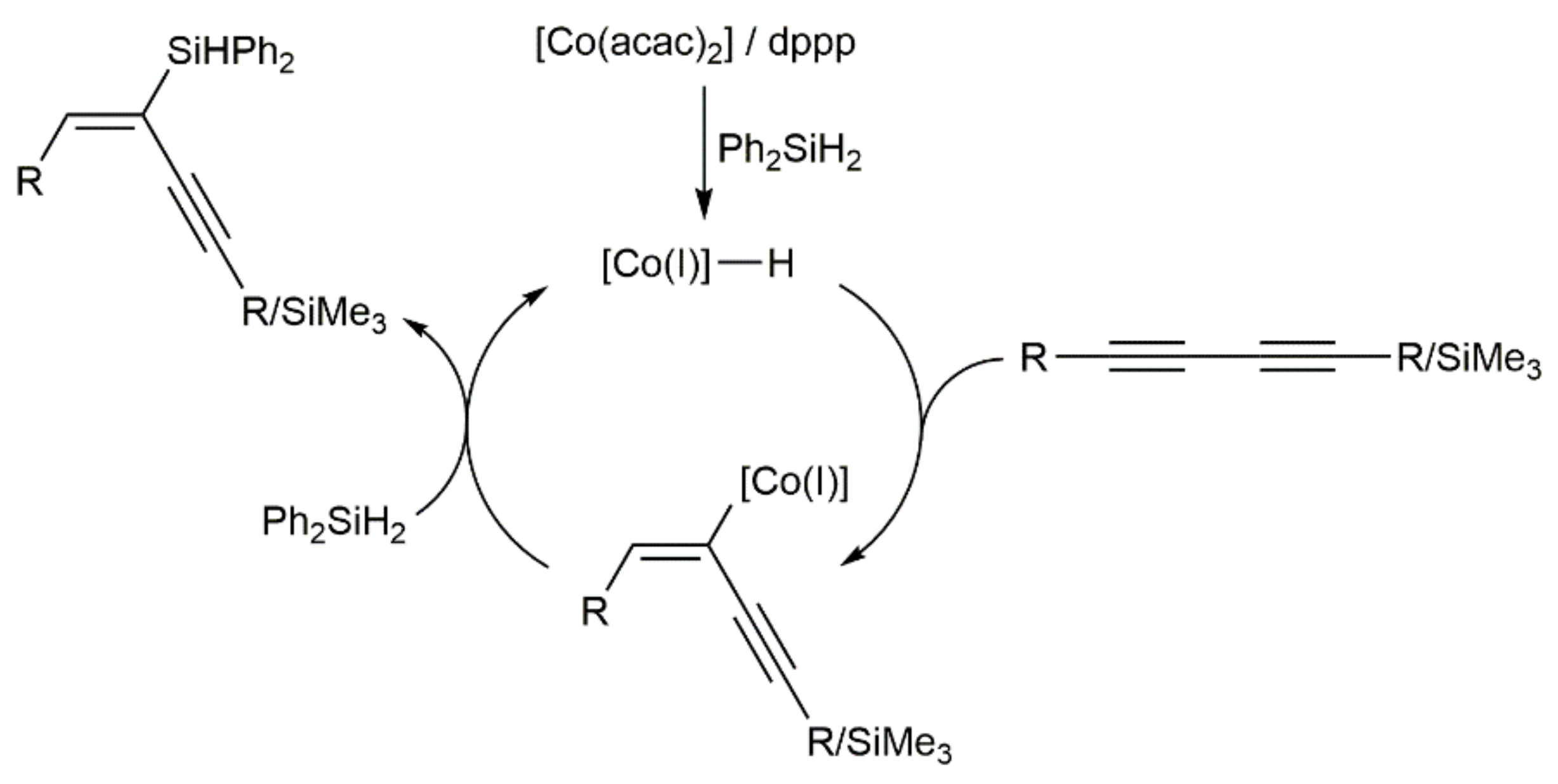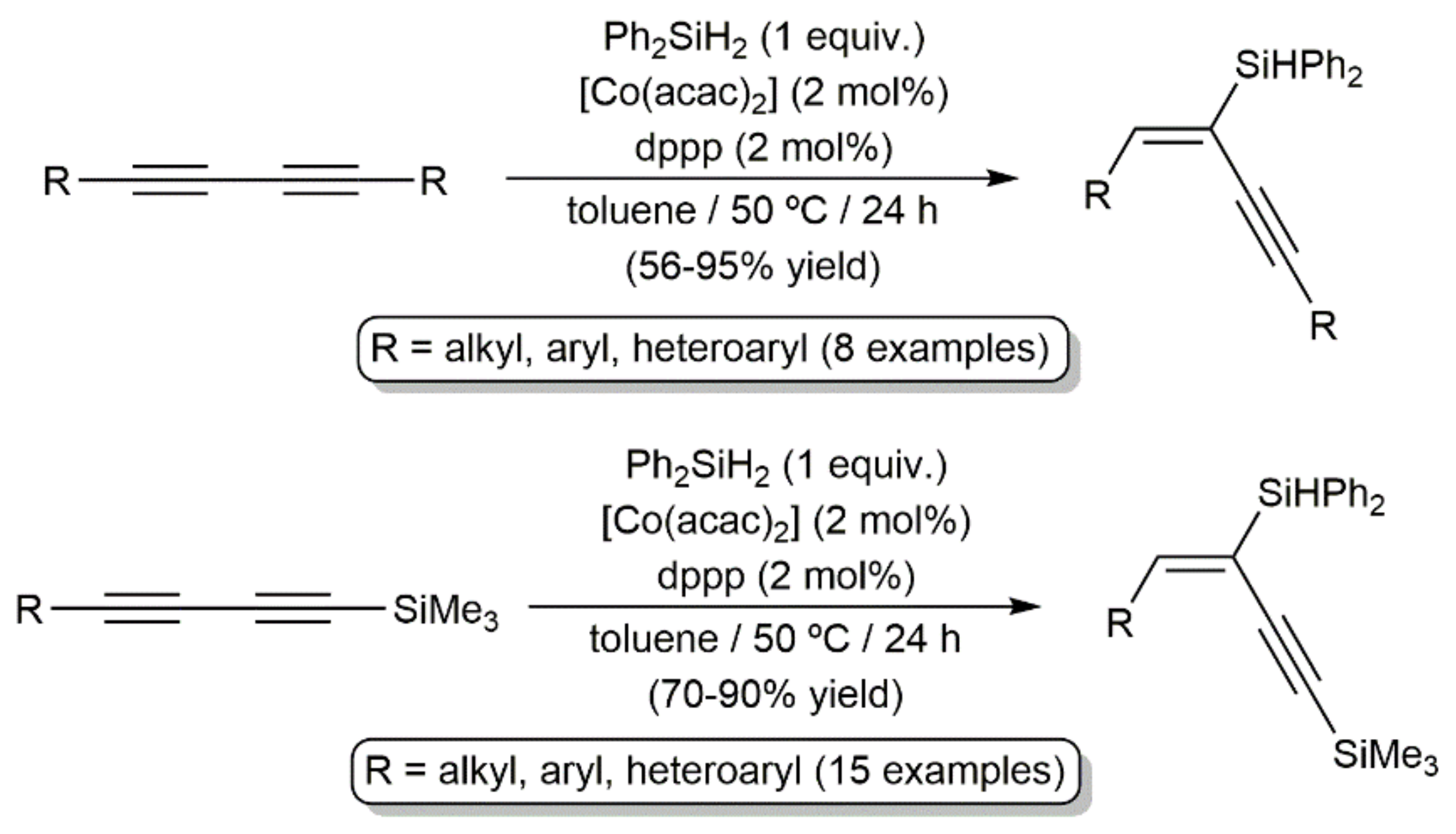 - Kong, D.; Hu, B.; Yang, M.; Gong, D.; Xia, H.; Chen, D. Bis(phosphine)cobalt-catalyzed highly regio- and stereoselective hydrosilylation of 1,3-diynes. Organometallics 2020, 39, 4437–4443. [Google Scholar] [CrossRef]