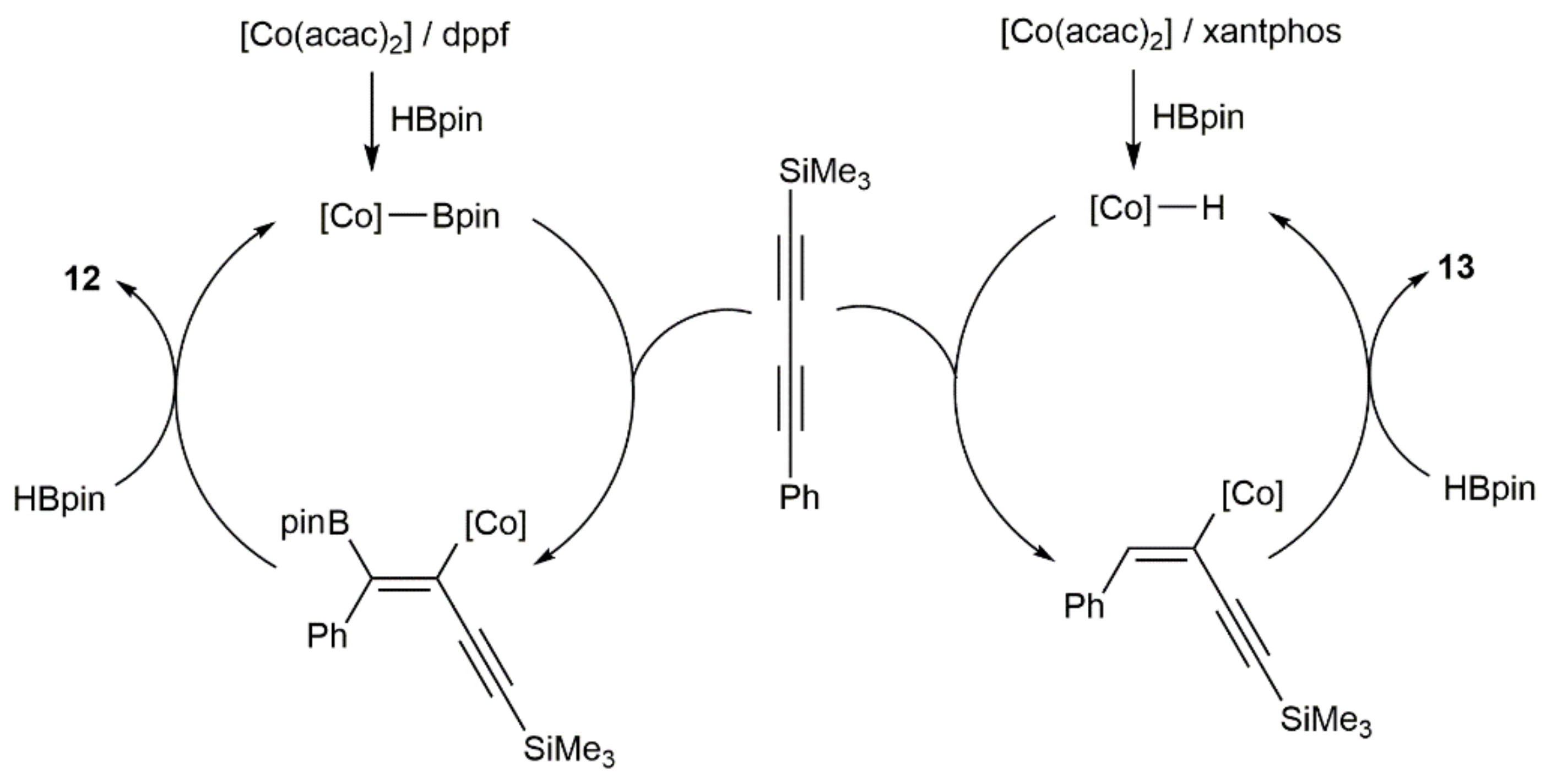 - Sang, H.L.; Wu, C.; Phua, G.G.D.; Ge, S. Cobalt-catalyzed regiodivergent setereoselective hydroboration of 1,3-diynes to access boryl-functionalized enynes. ACS Catal. 2019, 9, 10109–10114. [Google Scholar] [CrossRef]