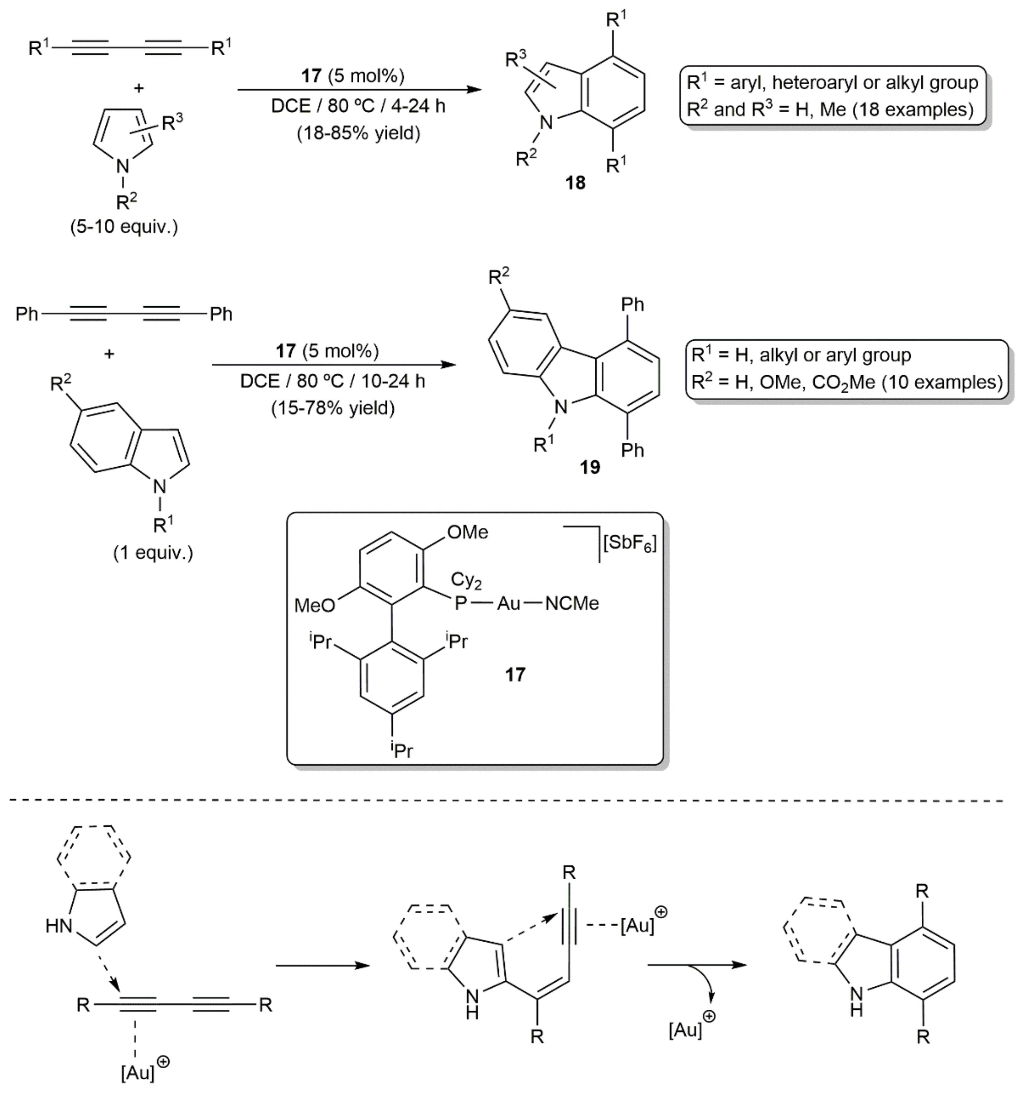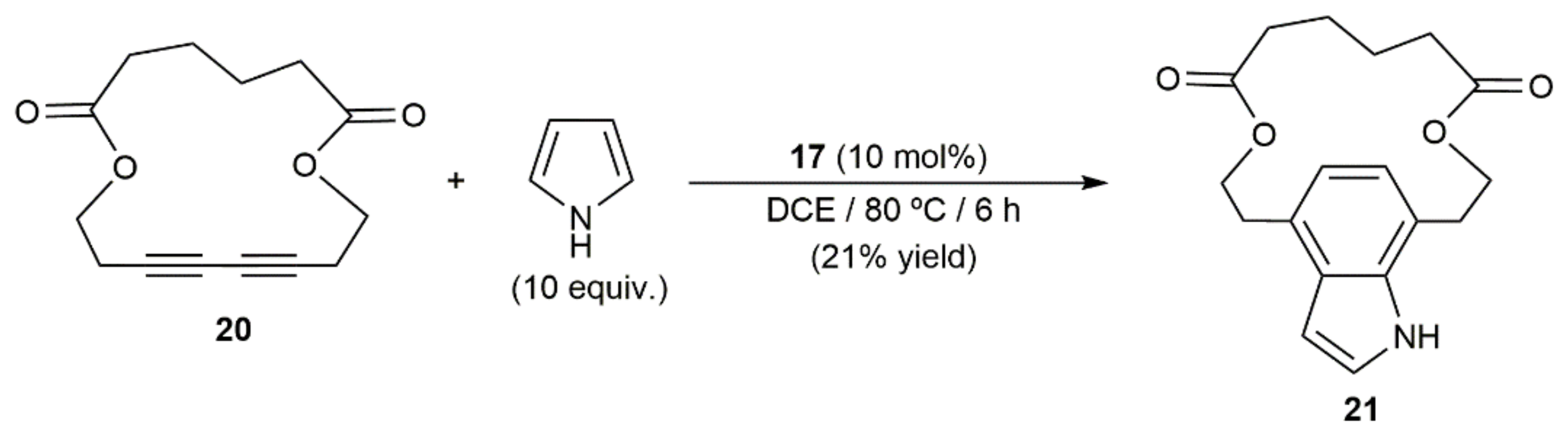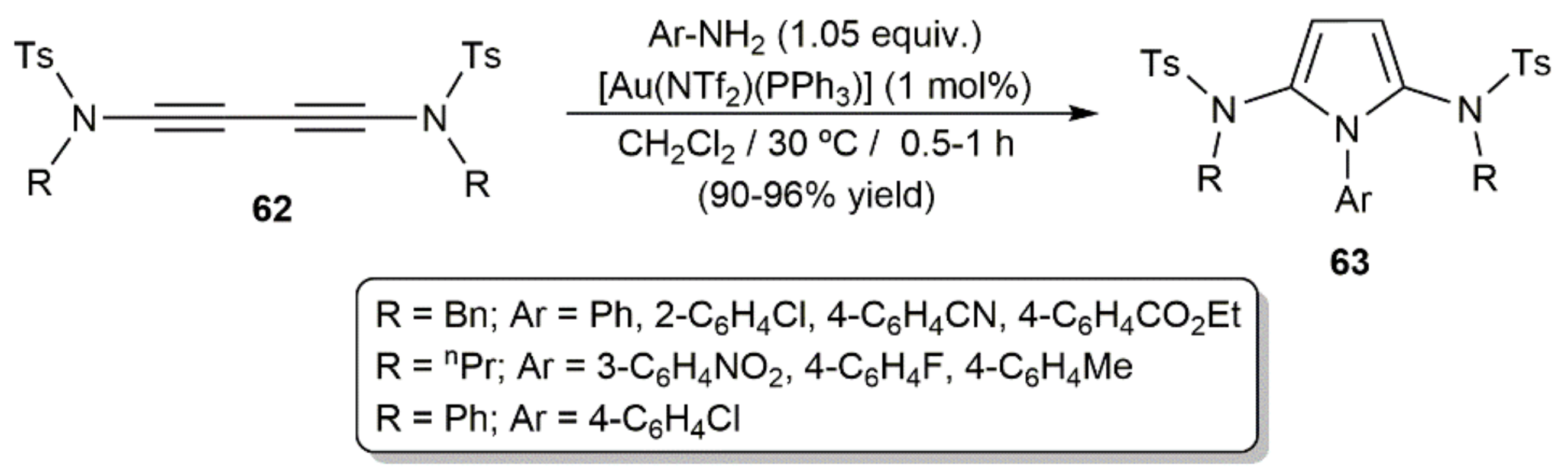 - Matsuda, Y.; Naoe, S.; Oishi, S.; Fujii, N.; Ohno, H. Formal [4+2] reaction of 1,3-diynes and pyrroles: Gold(I)-catalyzed indole synthesis by double hydroarylation. Chem. Eur. J. 2015, 21, 1463–1467. [Google Scholar] [CrossRef] [Green Version]