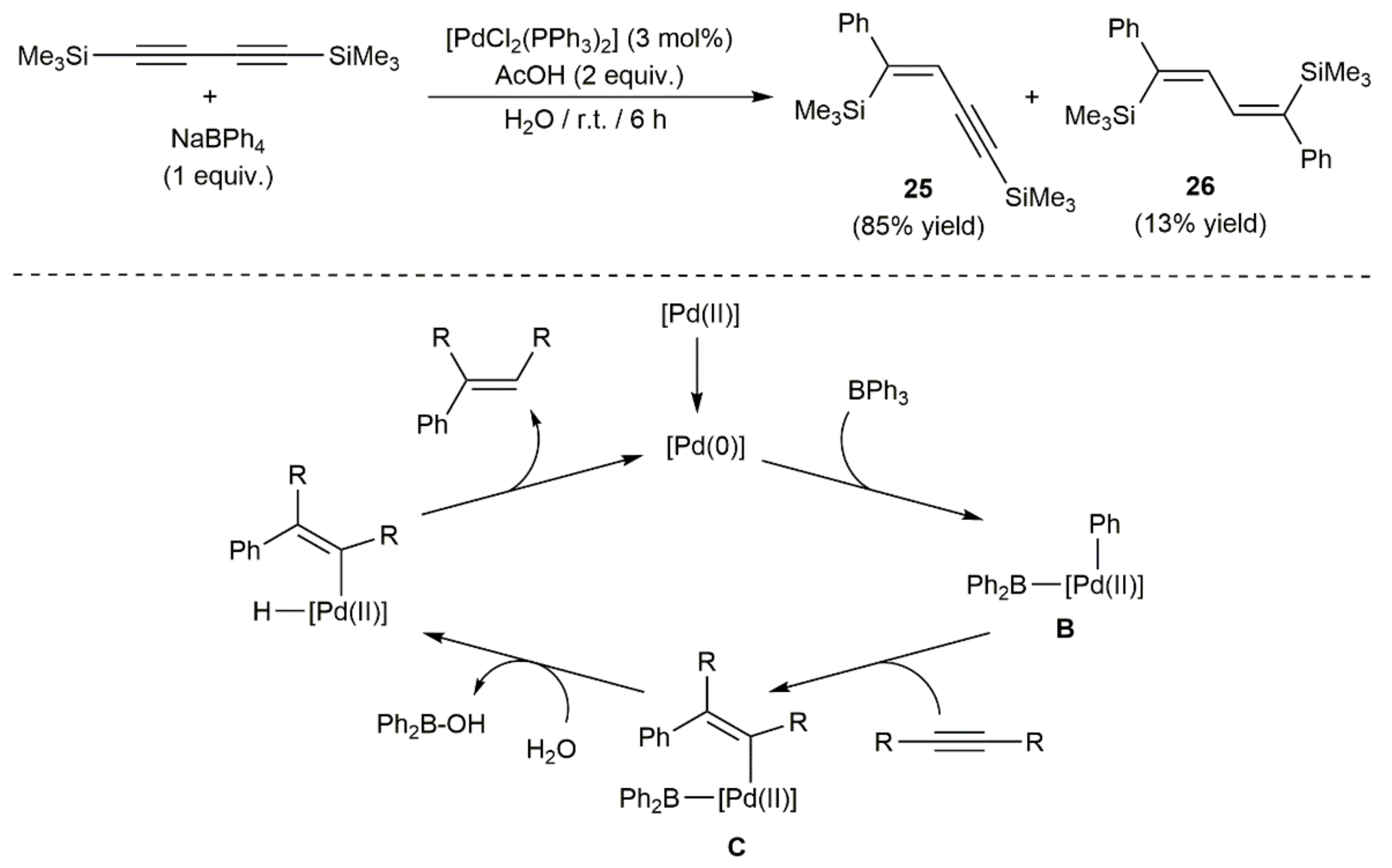 - Zeng, H.; Hua, R. Palladium-catalyzed hydrophenylation of alkynes with sodium tetraphenylborate under mild conditions. J. Org. Chem. 2008, 73, 558–562. [Google Scholar] [CrossRef] [PubMed]