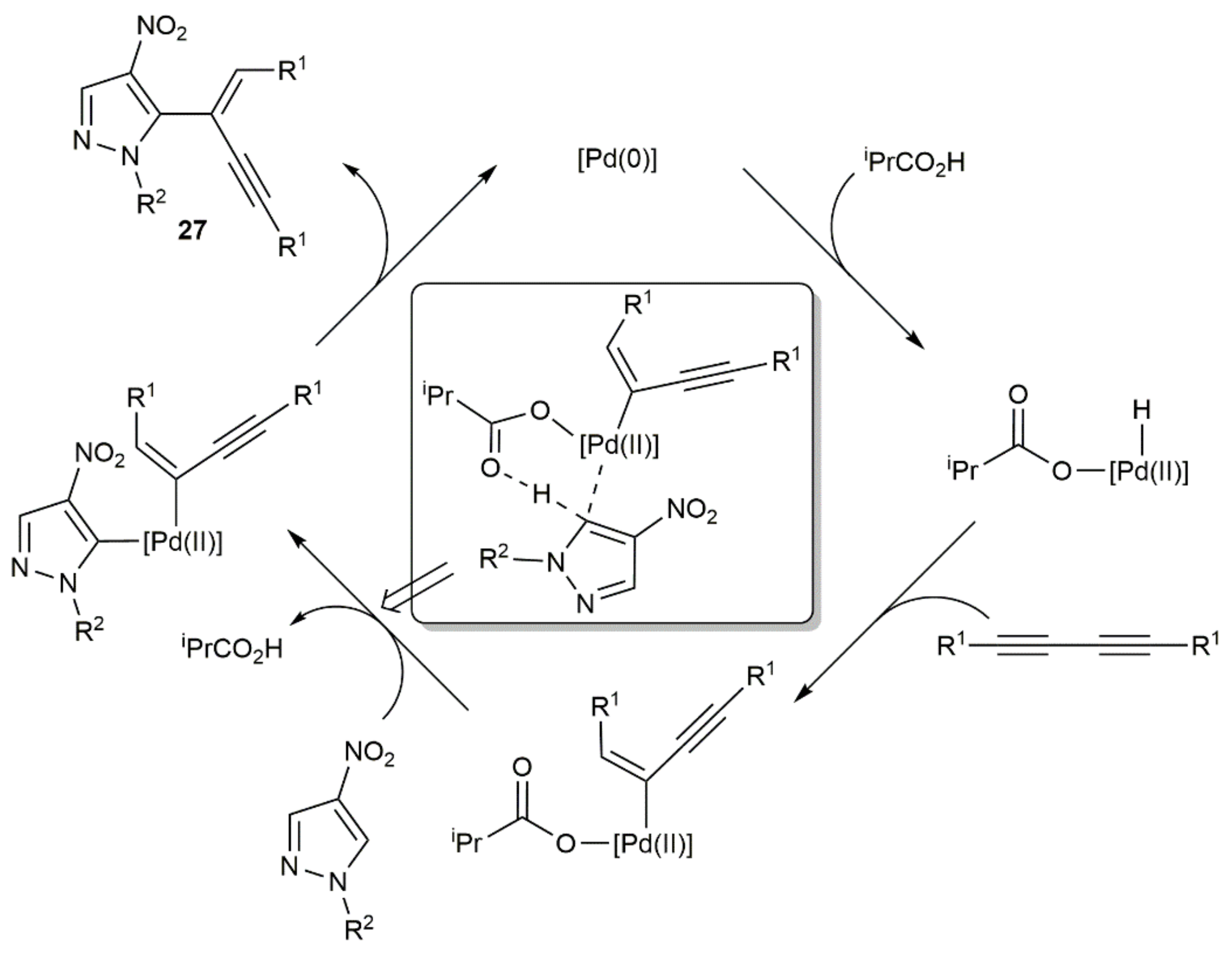 - Ha, H.; Shin, C.; Bae, S.; Joo, J.M. Divergent palladium-catalyzed cross-coupling of nitropyrazoles with terminal alkynes. Eur. J. Org. Chem. 2018, 2018, 2645–2650. [Google Scholar] [CrossRef]