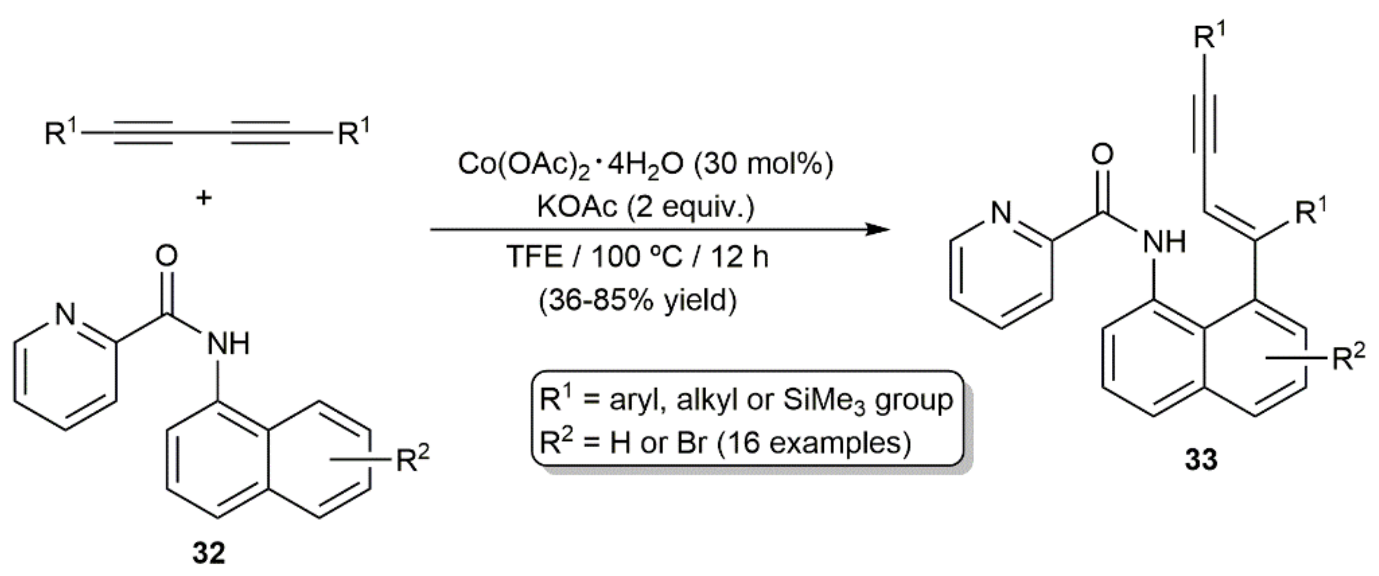 - Gao, Y.; Zhang, M.; Wang, C.; Yang, Z.; Huang, X.; Feng, Q.C. Cobalt(II)-catalyzed hydroarylation of 1,3-diynes and internal alkynes with picolinamides promoted by alcohol. Chem. Commun. 2020, 56, 14231–14234. [Google Scholar] [CrossRef]