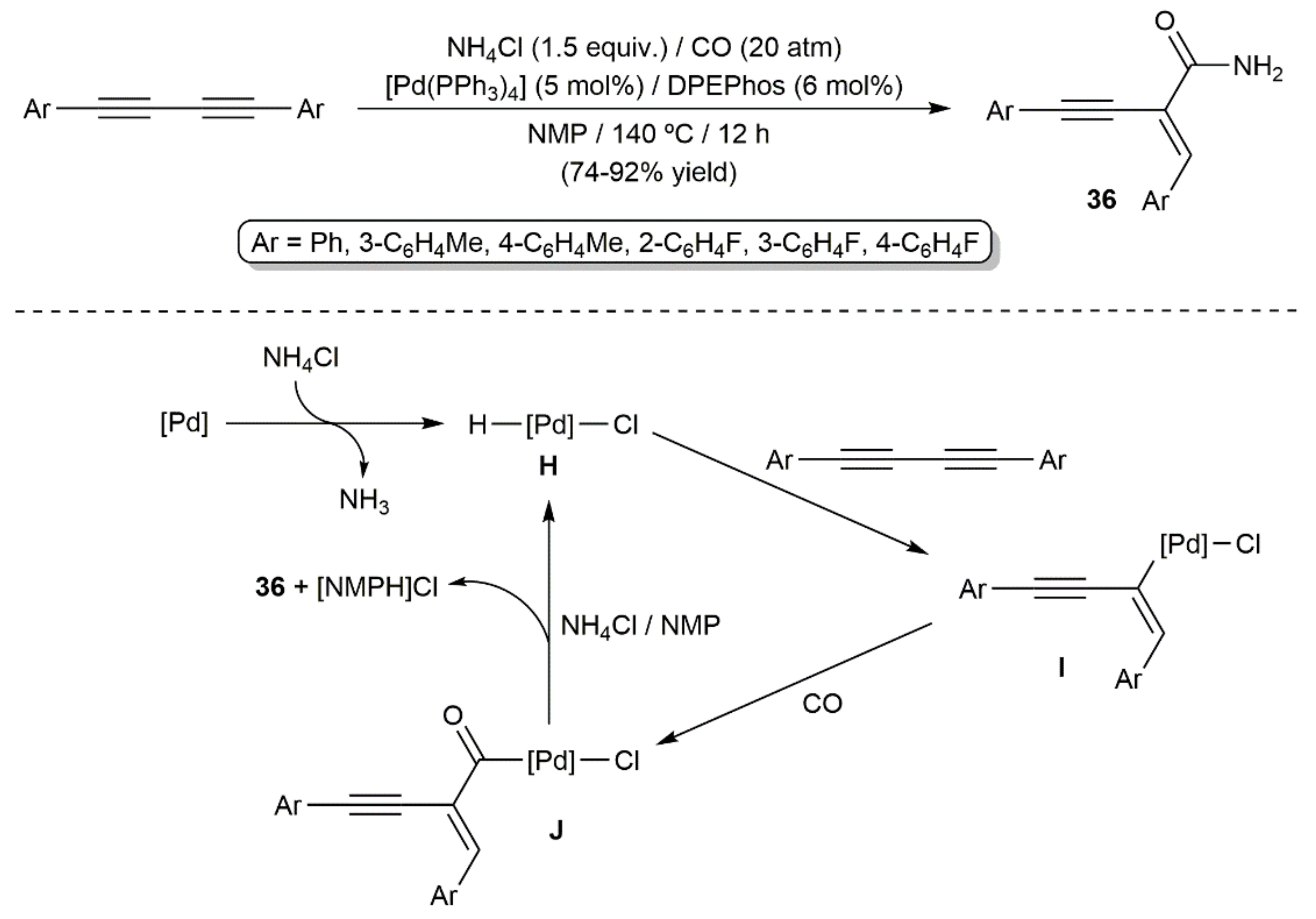 - Liu, J.; Schneider, C.; Yang, J.; Wei, Z.; Jiao, H.; Franke, R.; Jackstell, R.; Beller, M. A general and highly selective palladium-catalyzed hydroamidation of 1,3-diynes. Angew. Chem. Int. Ed. 2021, 60, 371–379. [Google Scholar] [CrossRef]