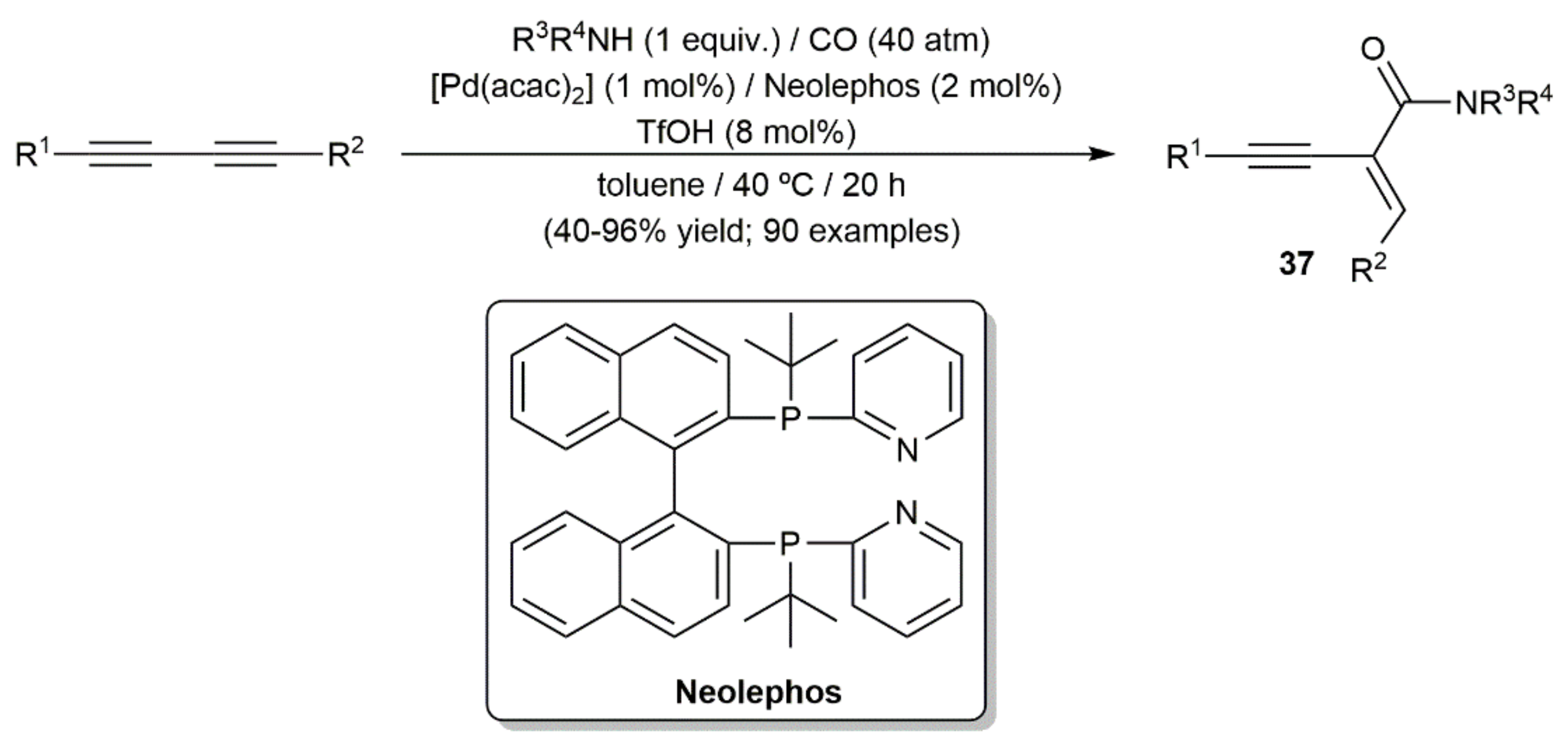 - Liu, J.; Yang, J.; Schneider, C.; Franke, R.; Jackstell, R.; Beller, M. Tailored palladium catalyst for the selective synthesis of conjugated enynes by monocarbonylation of 1,3-diynes. Angew. Chem. Int. Ed. 2020, 59, 9032–9040. [Google Scholar] [CrossRef]