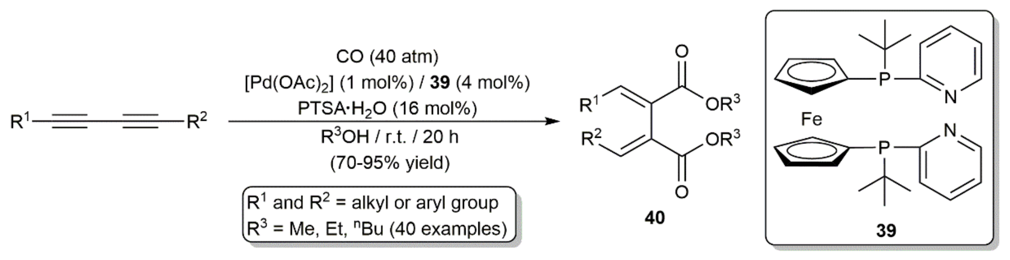 - Liu, J.; Yang, J.; Baumann, W.; Jackstell, R.; Beller, M. Stereoselective synthesis of highly substituted conjugated dienes via Pd-catalyzed carbonylation of 1,3-diynes. Angew. Chem. Int. Ed. 2019, 58, 10683–10687. [Google Scholar] [CrossRef] [PubMed]