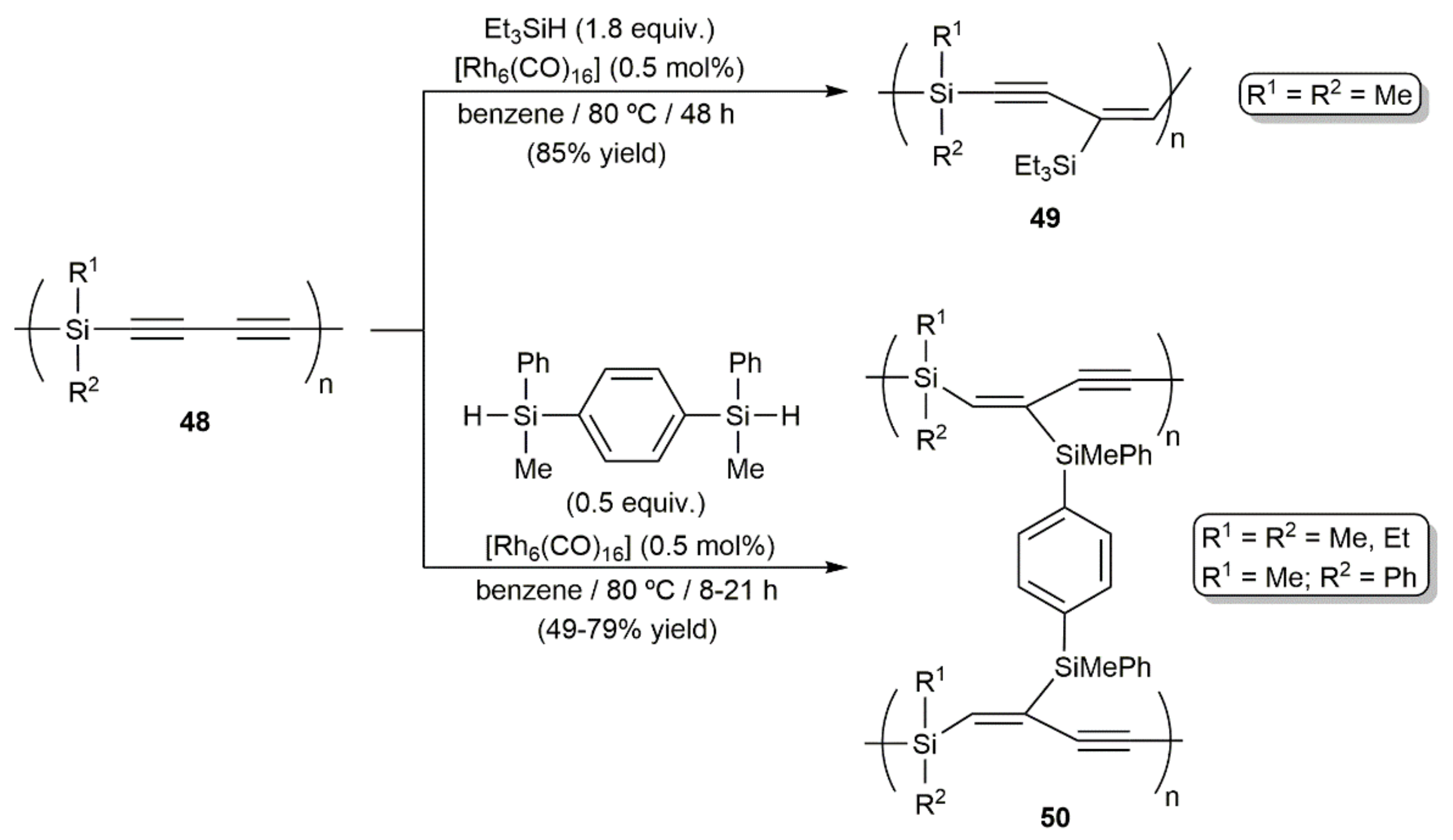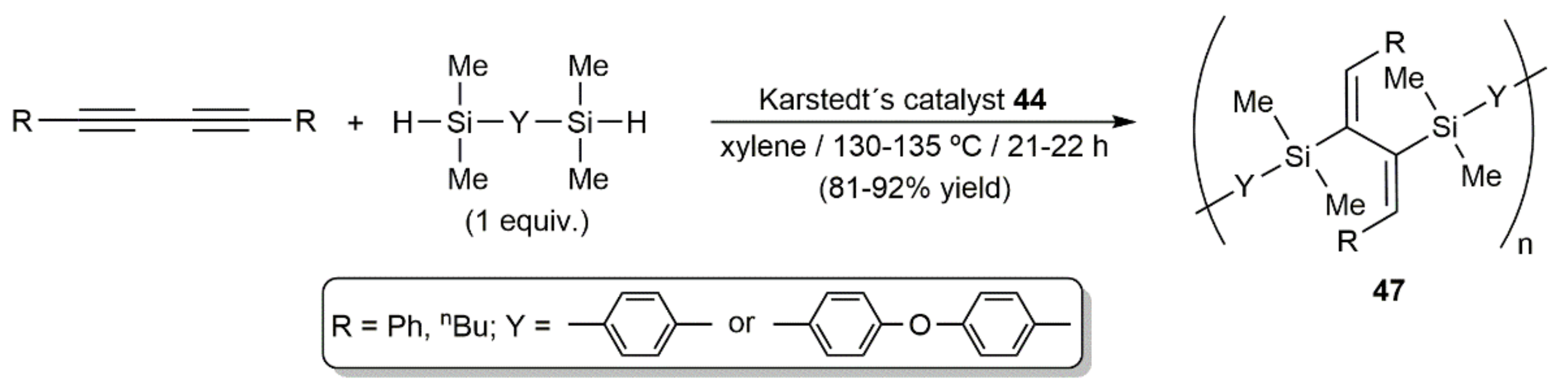 - Perry, R.J.; Karageorgis, M.; Hensler, J. Hydrosilylation reactions of 1,3-diynes and bis(silyl hydrides): Model studies and polymerizations. Macromolecules 2007, 40, 3929–3938. [Google Scholar] [CrossRef]