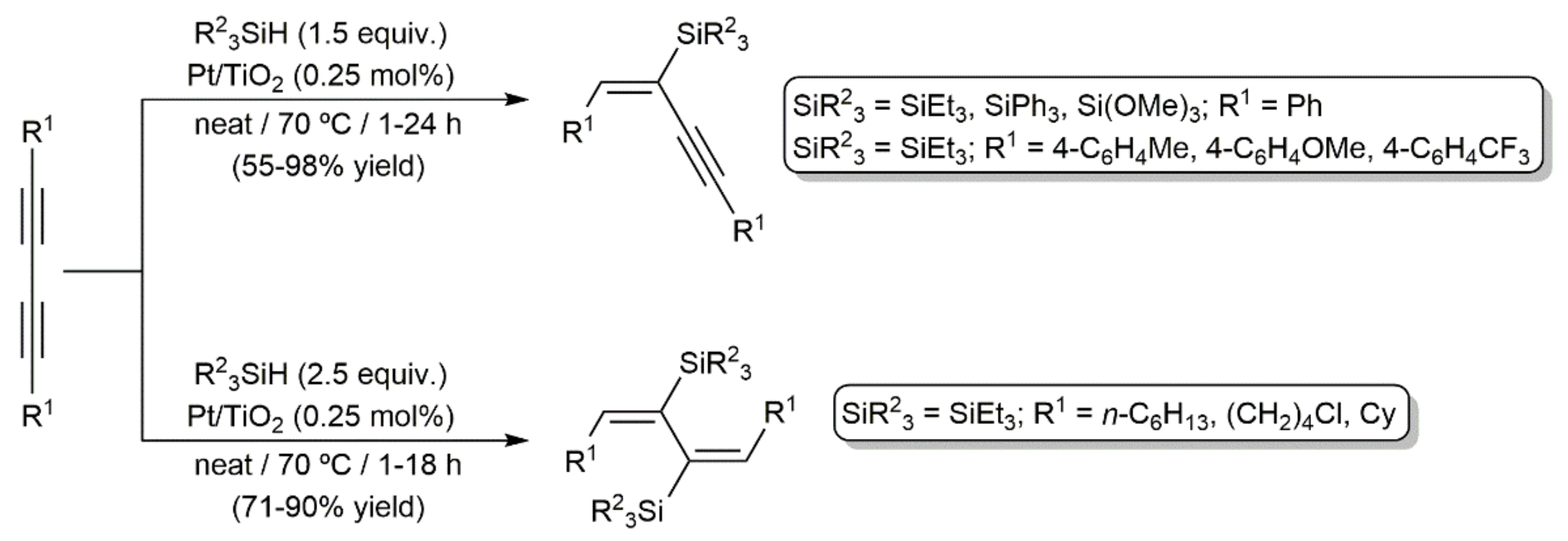 - Alonso, F.; Buitrago, R.; Moglie, Y.; Sepúlveda-Escribano, A.; Yus, M. Selective hydrosilylation of 1,3-diynes catalyzed by titania-supported platinum. Organometallics 2012, 31, 2336–2342. [Google Scholar] [CrossRef]