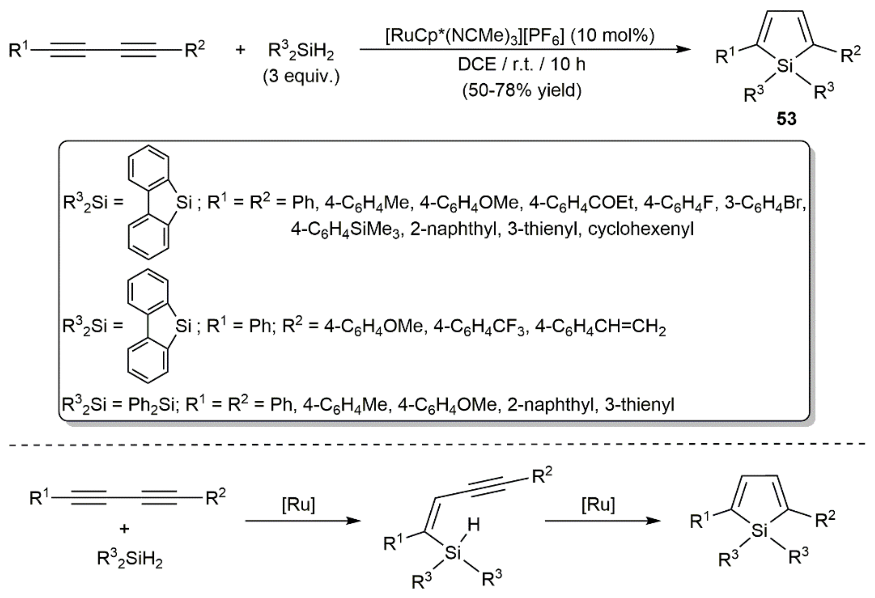 - Matsuda, T.; Kadowaki, S.; Murakami, M. Ruthenium-catalyzed trans-hydrosilylation of 1,4-diaryl-1,3-diynes leading to 2,5-diarylsiloles. Chem. Commun. 2007, 2627–2629. [Google Scholar] [CrossRef]